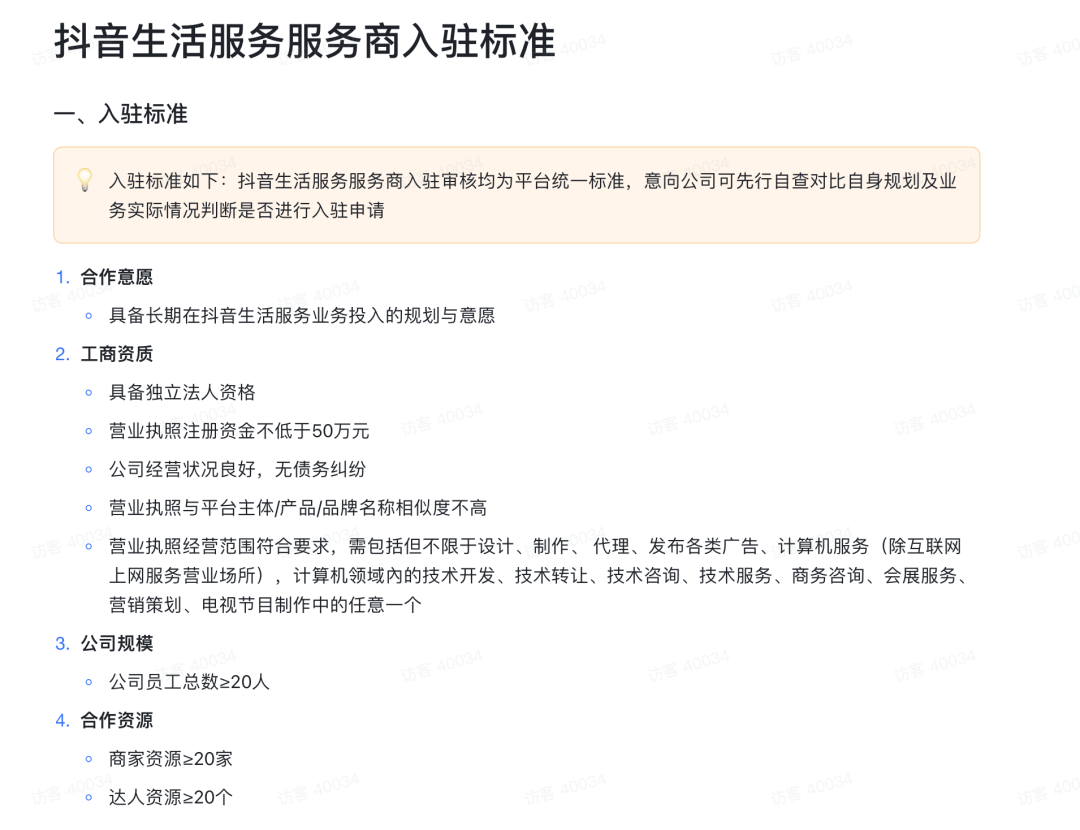 通过入驻该平台,可以成为官方认证的服务商。抖音对于服务商的入驻标准是,营业执照齐全,无债务纠纷,注册资金不低于50万,团队人员至少20人,并且有不低于20家商家资源和20个达人资源等。“这个准入标准和要求基本上相当于没什么限制,抖音其实是希望有更多的服务商来拓展新商家,实现快速拉新。”一位抖音服务商运营人员称。