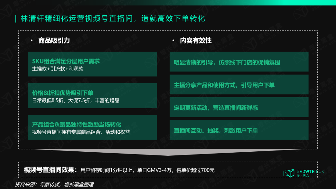将顾客吸引到店后,接下来最重要的,就是做好“接待”工作。林清轩视频号直播起盘半年,近期又受到新一轮疫情的影响,仍能通过精细化运营做到用户平均留存1分钟以上,单日GMV稳定在3-4万元,其经验值得借鉴。