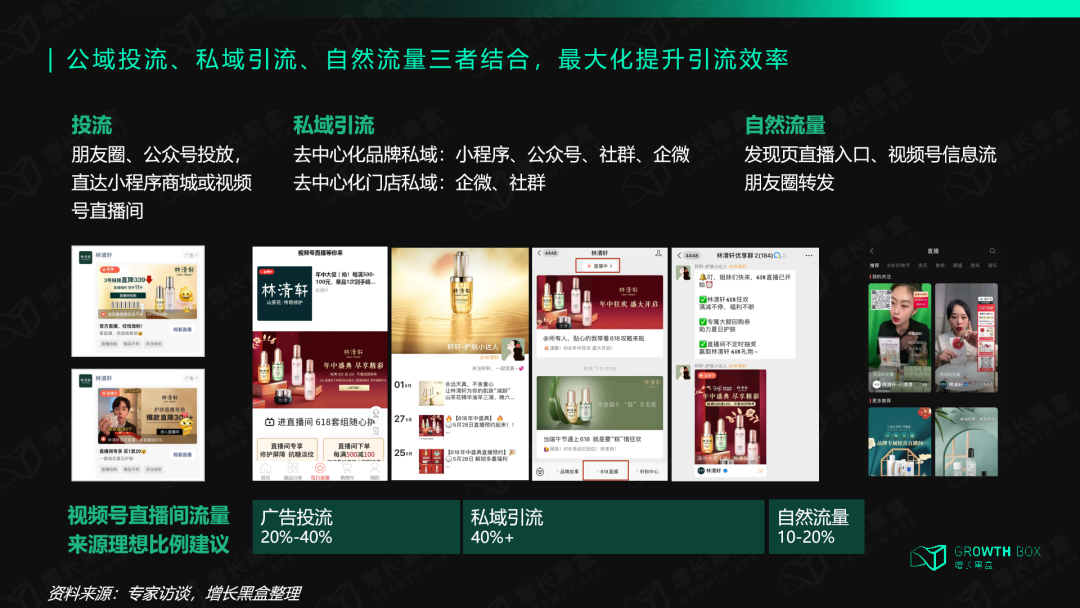在开始视频号投流之前,林清轩视频号直播间每日50%的流量来自私域,其中30%来自社群,20%来自公众号引流,另外50%才是自然流量。