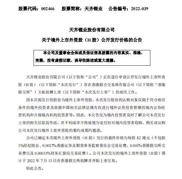 7月7日晚间,天齐锂业发布公告,预计将于本周三(7月13日)在香港联交所挂牌并开始上市交易,H股代码为9696.HK,发行价确定为上限82港元。