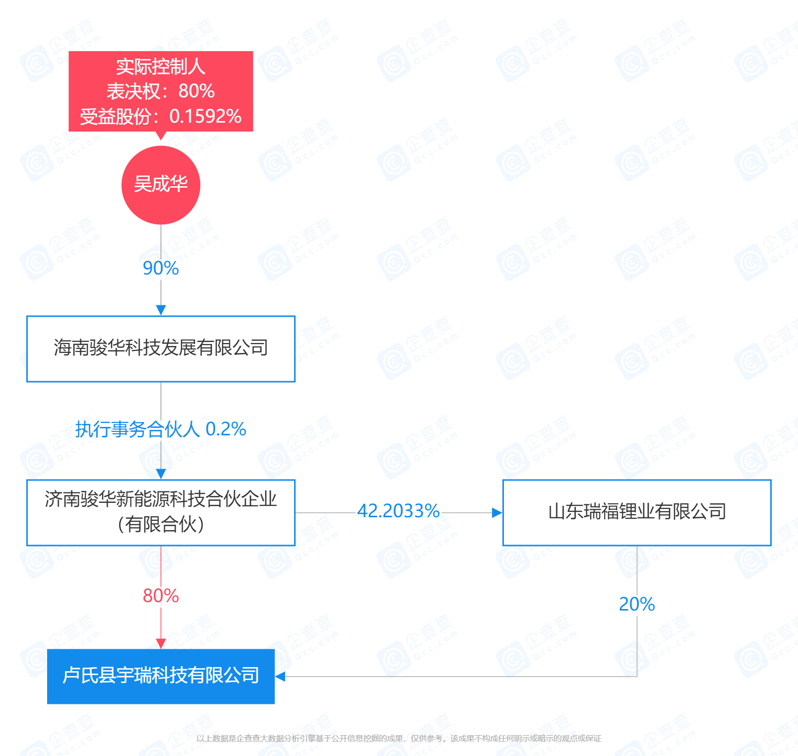 资料显示,宇瑞科技成立于2021年11月,由两名自然人赵乾、黄利共同出资600万元设立。2022年2月,其注册资本由600万元增加至3600万元,其中山东瑞福锂业有限公司(简称“瑞福锂业”)新增认缴出资1836万元,持股51%。今年9月-11月,经过多次股权转让,骏华新能源获得宇瑞科技80%股权,瑞福锂业持有宇瑞科技20%股权。