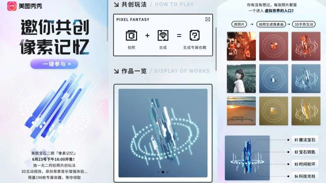 「像素记忆」数字收藏品为拍照共创玩法,限量198枚,用户拍照合成就可以生成属于自己的专属共创数字藏品。这也是美图公司在像素诞生50周年之际,对像素文化和美学的致敬。