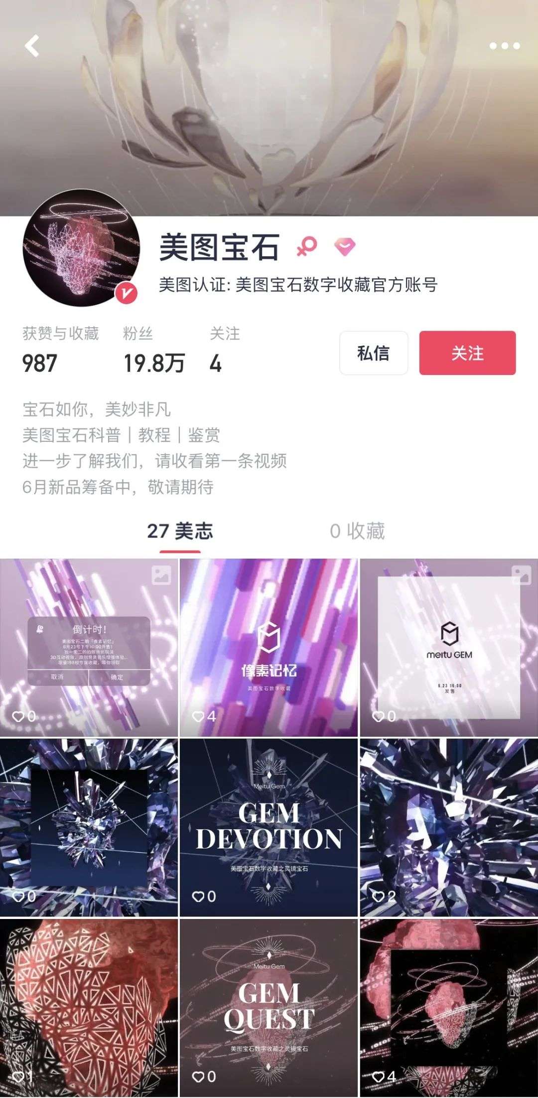 在美图秀秀App,认证内容为“美图宝石数字收藏官方账号”的“美图宝石”,目前已有19.8万粉丝。美图秀秀App搜索页显示,“像素记忆”搜索量已达11.6万。