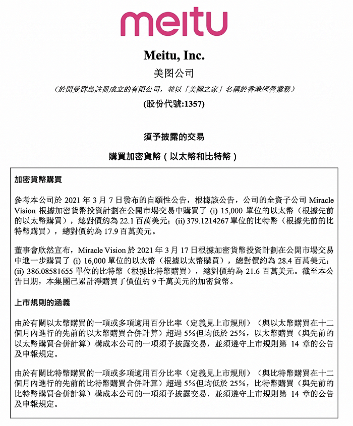 2021年3月7日,美图公司斥资2160万元购买比特币的消息一度引起业界热议。当时的公告显示,截至2021年3月17日,美图公司已累计净购买了价值约9千万美元的加密货币。