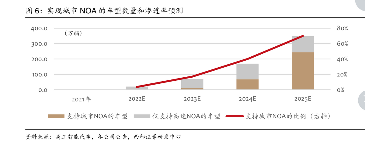 数据表明,在国内,实现NOA的车型渗透率也在不断上升,西部证券的一份研究报告预测,2023年到2024年,市场上支持城市NOA的车型渗透率将迅速增长到20%,