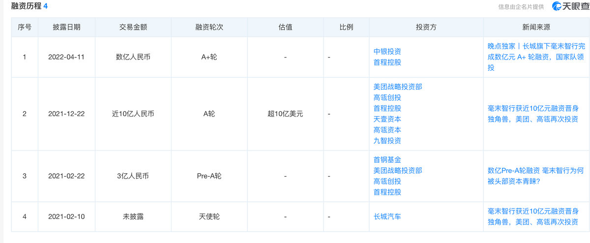 华为的ADS和毫末的NOH,能够基于高精地图的位置信息结合车辆硬件的感知能力做识别,在地图数据的辅助下,车辆更容易准确识别道路、红绿灯等信息。天眼查APP显示,在一级市场上,毫末已经走到了A+轮融资。