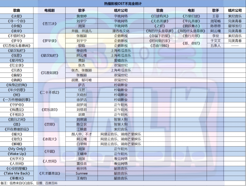 但这样的艺术追求并不是多数,大部分标配的影视OST还是呈现出模式化、高效率的流水线生产特质。从唱片公司来看,统计发现,发行影视OST的公司,除了业内较为熟知的影视音乐公司希瓜音乐和智慧大狗外,剧集所属的华策影视、柠萌影业、正午阳光等剧方常常一手包办剧集OST。