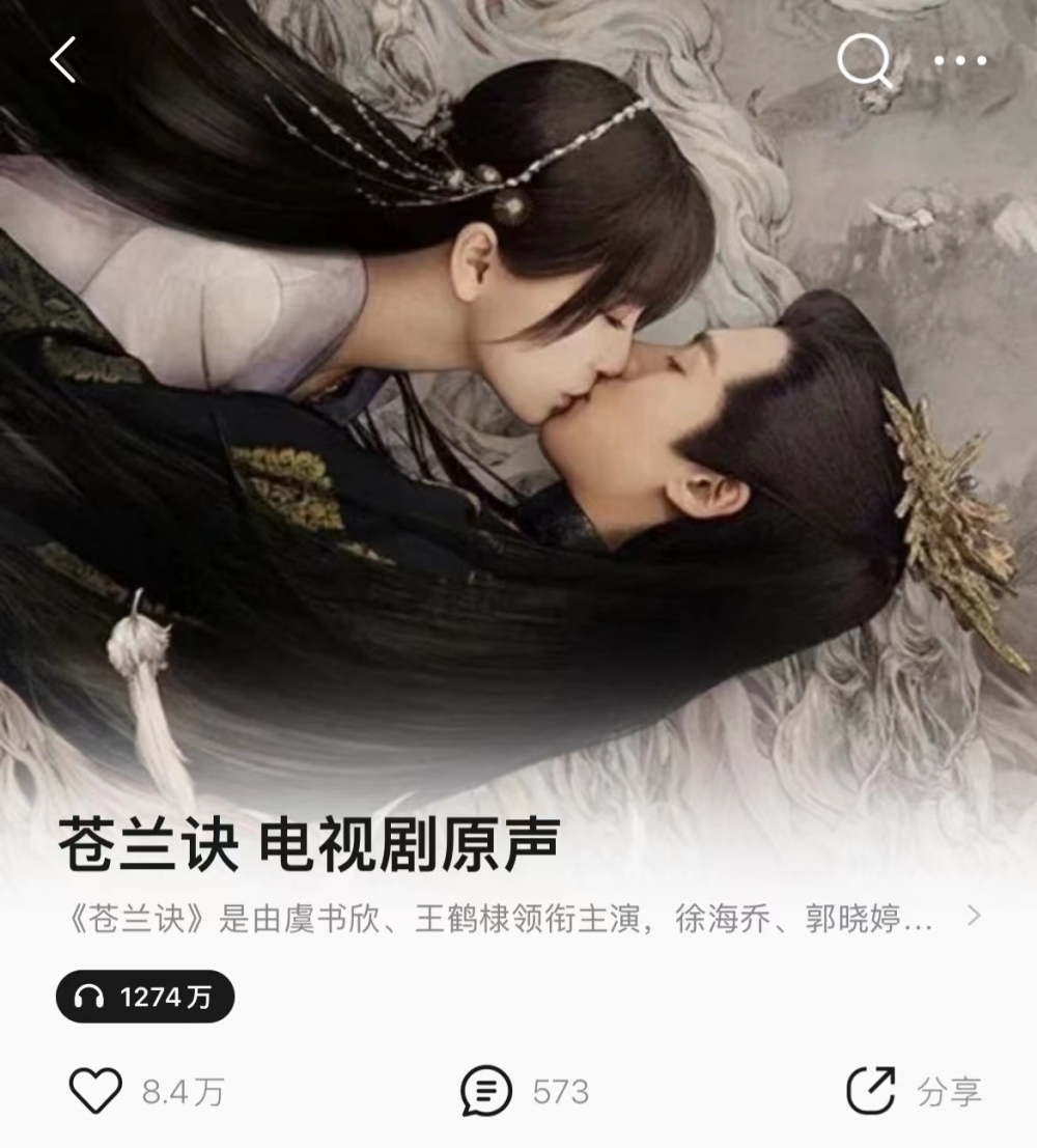 以《苍兰诀》原声音乐为例。作为OST原声专辑,从专辑内容来看,收录了女主角虞书欣演唱的《失忆》、李常超演唱的《苍兰契》、沈以诚演唱的《我还记得那天》等。宣发走的是原创音乐人的路子,以专辑的方式参与了酷狗平台以酷狗音乐人·星曜计划,歌曲版权在其旗下唱片公司慢吞吞文化。根据官方数据,在TME音乐集团旗下四个平台内,《苍兰诀》影视原声音乐OST总收藏量突破千万。