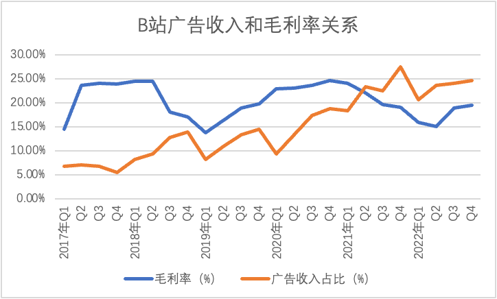 虽然很多人总认为广告业务“不性感”“缺乏创新性”,但客观来看广告的高性价比,边际成本接近于0,对一些企业是非常重要的。B站亦是如此,其毛利率一直与广告收入占比呈明显的正相关性,只是在2021年广告收入占比上升但毛利率却在下降,其原因为: