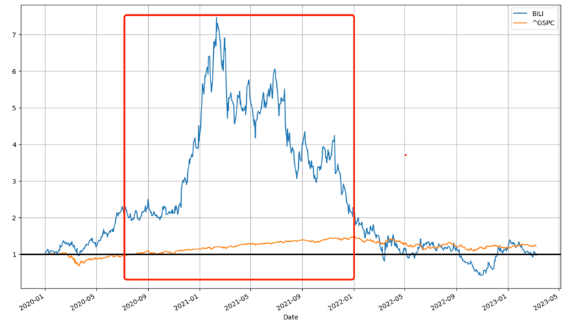成长股往往是具有强β属性(波动程度往往是大盘波动的数倍),这在B站也可以得到非常好的展示。在上图中B站波动性非常明显要大过大盘,这也再次验证了我们上述的观点,尤其在2022年之后两条折线的分歧有放大的势头,也就是前文所说的市场预期和企业现状错配导致分歧扩大。