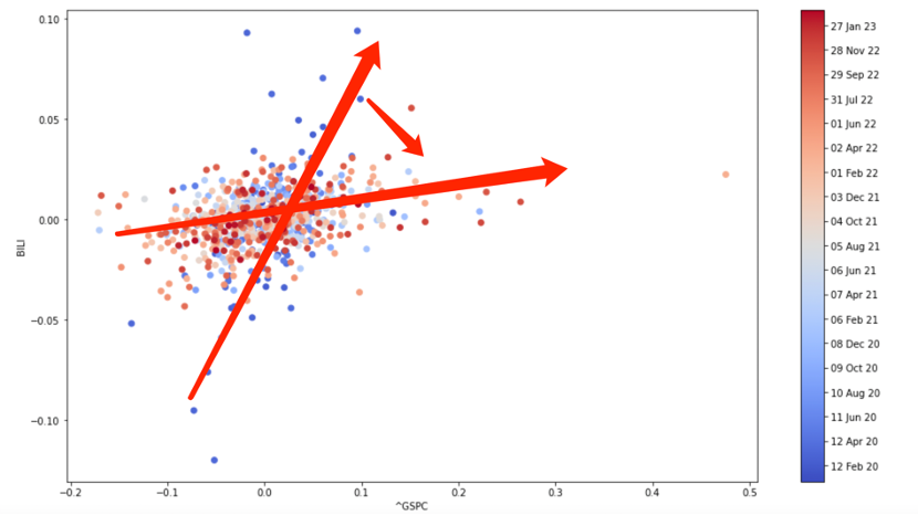 用散点加时间轴分布的形式表达更为直观,在上图中我们我们确实也能看到随着时间的推进,大盘标普500指数与B站分布的斜率在减小,也可理解为相较于大盘,企业股价的波动性在下降,稳定性在改善,这对于当前的B站则是好事。