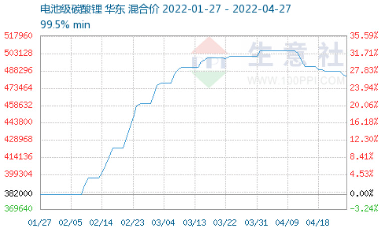 具体而言,清明节前后,受上海和长春等地疫情蔓延影响,特斯拉、蔚来、一汽等车企均有不同程度停产,叠加疫情管控下车企零部件供应受阻,市场对新能源汽车需求担忧情绪较重,百川锂价自4月11日开始回调,截至4月26日电碳报价为47.54万元/吨。锂精矿价格仍继续走高,二季度澳矿长协价在5000美元/吨左右,成本端对锂盐价格形成支撑。随着各地疫情的有效管控,特斯拉等车企已正式复产,预计三季度新能源汽车产销量将恢复旺季增速,锂价有望止跌企稳,维持高位运行。