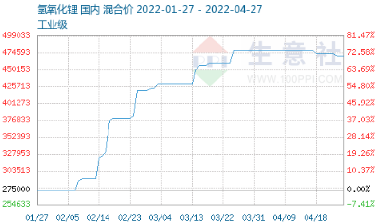 以下附图两张,来直观感受一下氢氧化锂和电池级碳酸锂一季度的涨势: