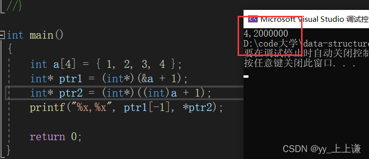 int main() { int a[4] = { 1, 2, 3, 4 }; int* ptr1 = (int*)(&a + 1); int* ptr2 = (int*)((int)a + 1); printf("%x,%x", ptr1[-1], *ptr2); return 0; }公布答案: