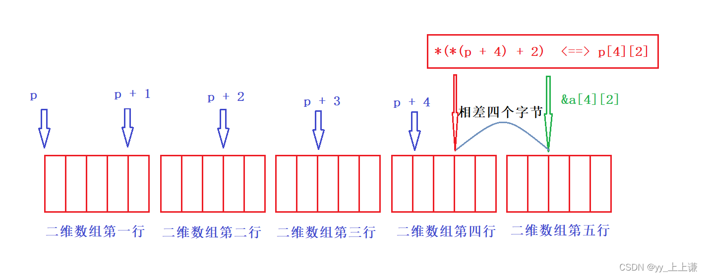 a[4][2]的地址比p[4][2]的地址高4,所以结果为-4;