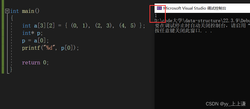 int main() { int a[3][2] = { (0, 1), (2, 3), (4, 5) }; int* p; p = a[0]; printf("%d", p[0]); return 0; }公布答案: