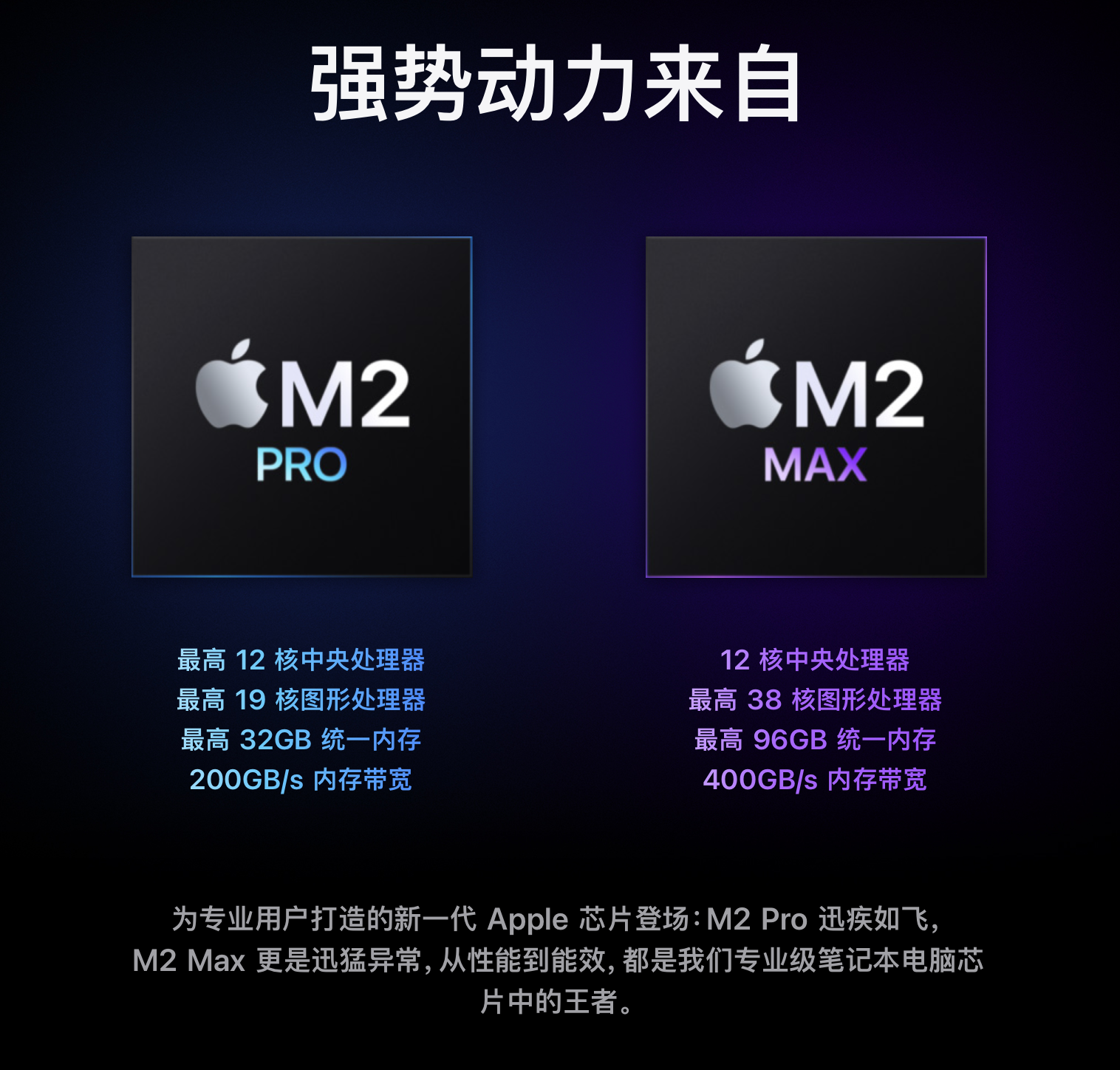M2 Pro的封装晶体管是M2的两倍,达到了整整400亿个,相比M1 Pro提升了约20%(337亿个),内存方面也提升了50%,最高可支持32G内存,另外内存带宽也翻倍达到了200GB/s。你也可以把它看做是将两块M2处理器通过特殊的方式连接起来从而获得了双倍的性能表现。