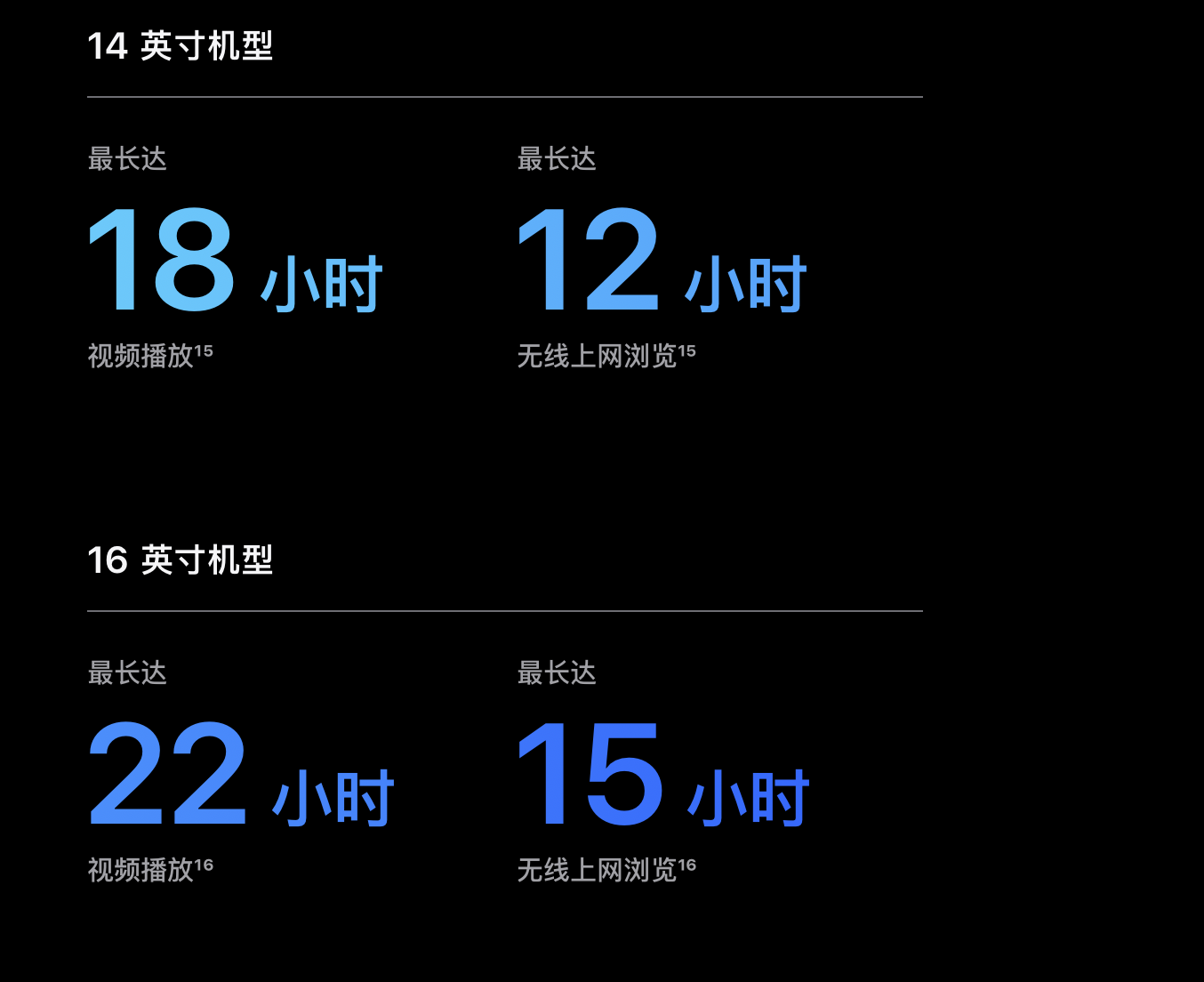 除了在性能方面的提升外,苹果还表示搭载M2 Max的16寸 MacBook Pro续航时间达到了惊人的22小时,是历代MacBook Pro中最长的。针对这个成绩小雷也简单查询了一下官网资料,22小时续航时间指的是连续播放22小时1080P影片,如果换算成日常使用的话应该在12到14小时左右,不过也是一个非常恐怖的续航成绩了。另外值得一提的是HDMI接口升级到2.1版本,意味支持到4k@120hz或8k@60hz。