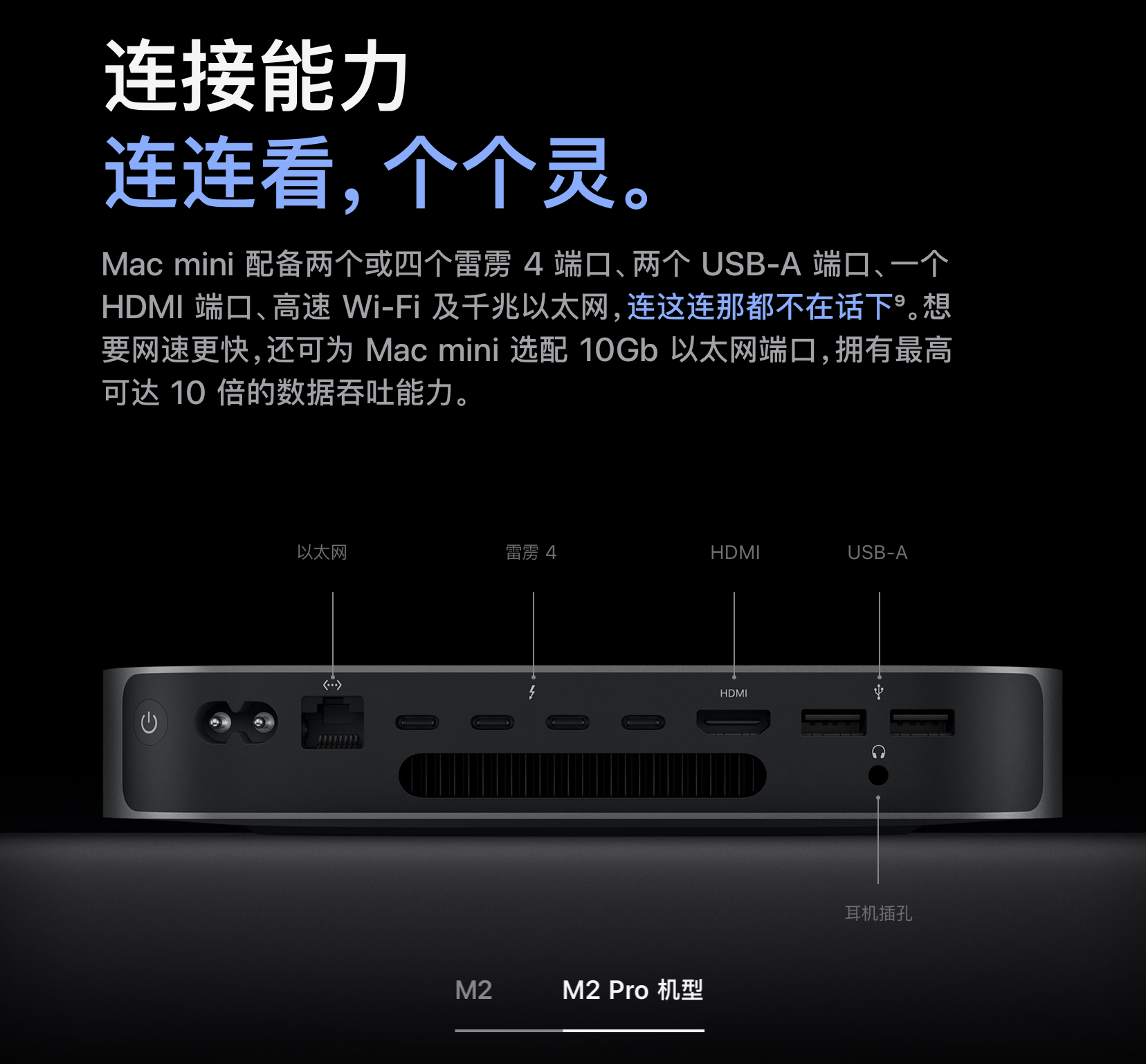 其他配置方面,新款Mac mini还解决了不少痛点,例如M2 版本的雷电口可以连接到两台外接显示器,M2 Pro 版本则可以连接三台;M2 Pro 版本的雷电接口数量也由两个增加到四个等等。另外还将蓝牙从5.0升级为了5.3,Wi-Fi从Wi-Fi 6升级到了Wi-Fi 6E(适用于中国大陆以外的国家和地区),并且支持了ProRes和ProRes RAW的硬件加速等等等等。