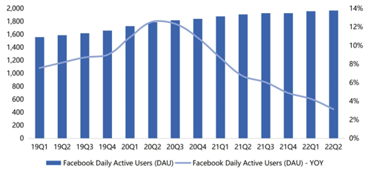 一年就要亏掉100亿美元,而近两年广告收入又受到影响,导致地主家也没有多少余粮了。比广告收入减少更危险的是Meta在社交领域的成长性正在失速,旗下Facebook用户DAU增速已经放缓。