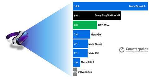 图1:2016-2021年VR产品销量榜单(单位:百万台);资料来源:Counterpoint Research’s XR (AR & VR headsets) Model Tracker