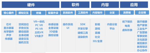 跟智能手机类似的成长路径,VR行业爆发是要产业链上下游形成共振之势。具体来说,VR的产业链主要包括硬件、软件、内容和应用4个方面,核心硬件则涵盖芯片、显示屏幕、光学器件等。( 正因为和手机产业链十分相似,所以我们看到VR和手机的产业链玩家有较高的重合度 )