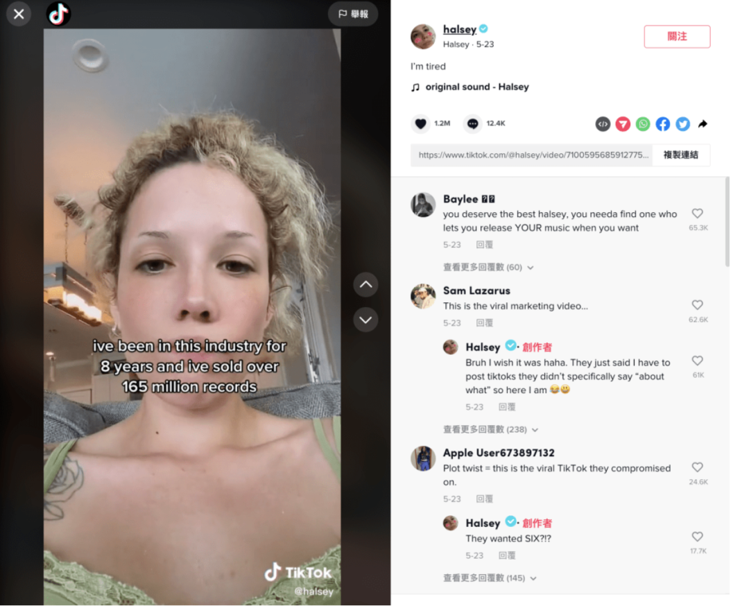Halsey 对她的粉丝说:“我在这个行业已经8年了,唱片销量超过1.65亿张,而我的唱片公司却说,他们要在TikTok上造势火了,我才能发行这首单曲,我只是想发音乐,我应该得到更好的(对待)。”