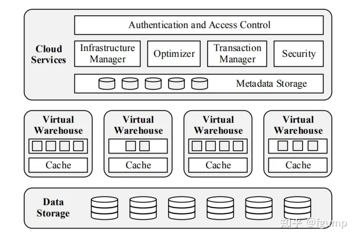 SnowFlake通过VW和S3来将计算和存储分离。整体上来看是使用了Shared Disk架构。但是为了减少VW和S3之间的数据传输,SnowFlake通过本地磁盘做一个cache系统。如果cache系统做的比较好,那么性能上面几乎可以媲美于share nothing架构。