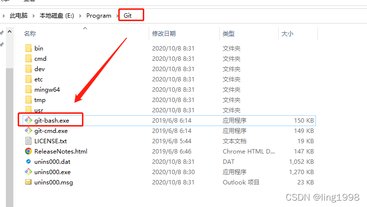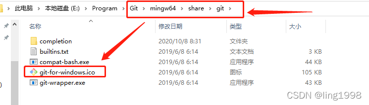找到安装Git目录, Git > mingw64 > share > git,显示ico图标,记录文件路径,此时我本地的路径为 E:\Program\Git\mingw64\share\git\git-for-windows.ico