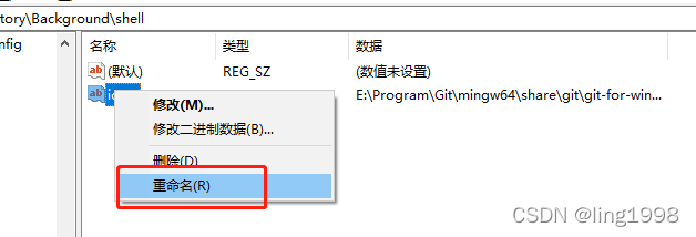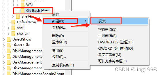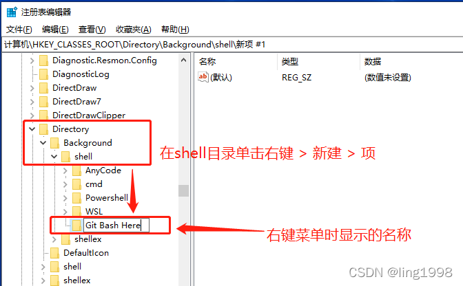 回到注册表编辑器,右键单击Git Bash Here目录,选择新建 > 字符串值