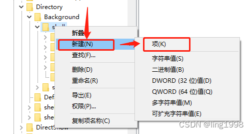 找到 HKEY_CLASSES_ROOT > Directory > Background > shell,若没有shell,新建shell目录即可。