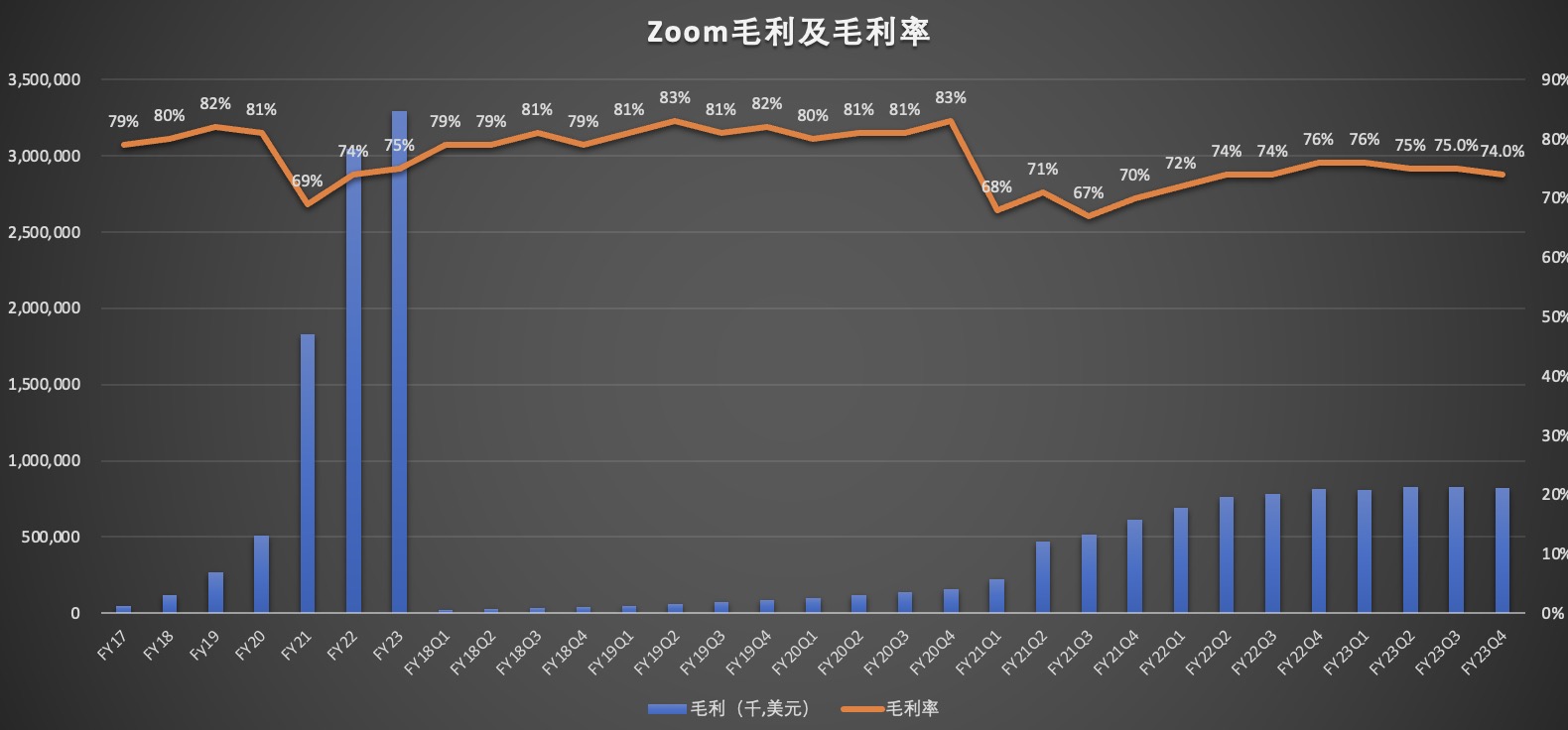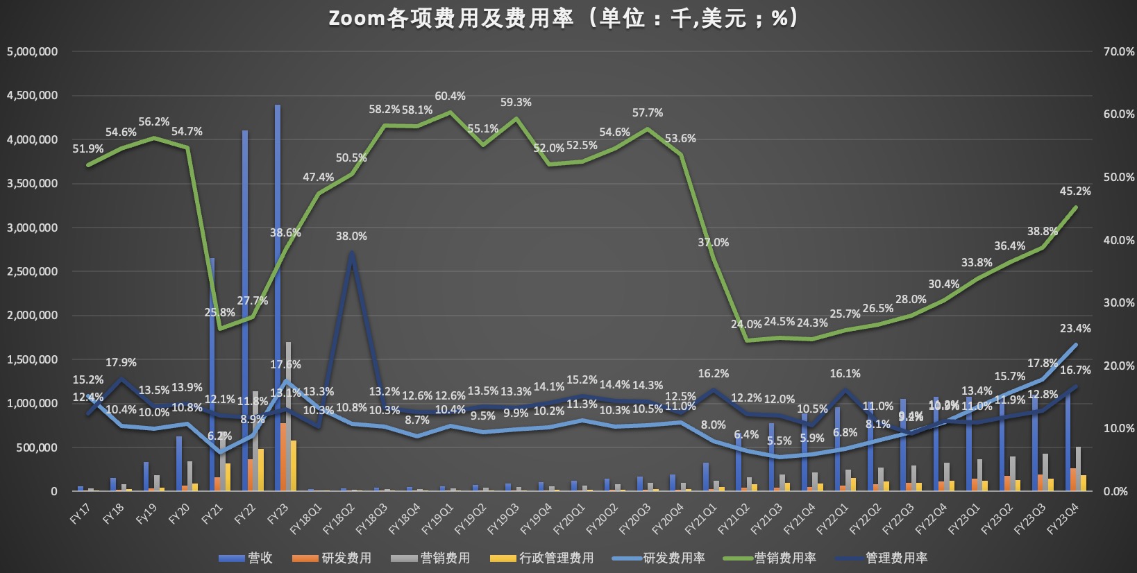 数据显示,23财年Zoom总运营费用为9.533亿美元,与上一财年同期的5.622亿美元相比,增长69.6%。