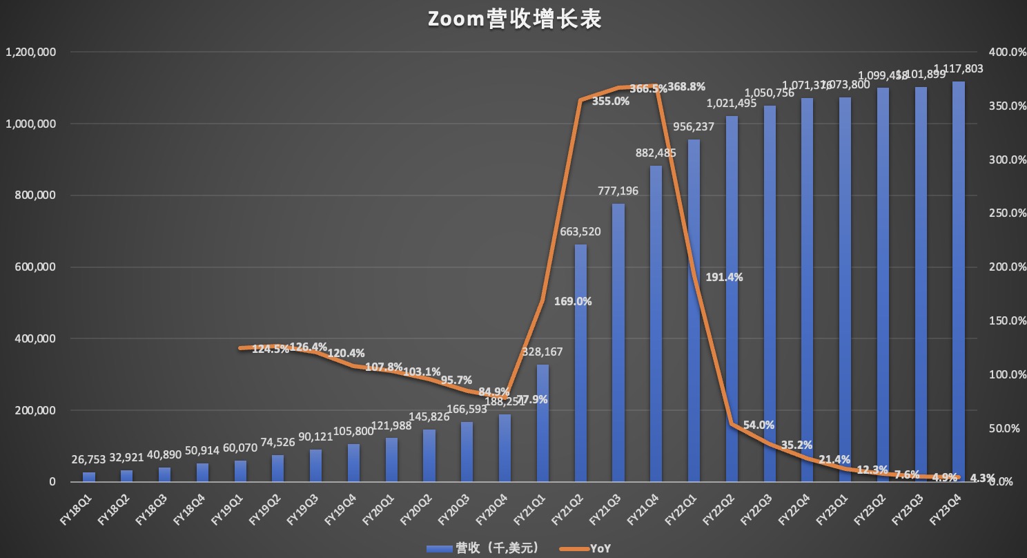 在整个2023财年,Zoom的总营收为43.930亿美元,与上一财年的40.999亿美元相比增长7%,而上一财年的同比增速为54.6%。没有疫情的催化,Zoom的高增长从此成为历史,未来高增长也恐难再现。