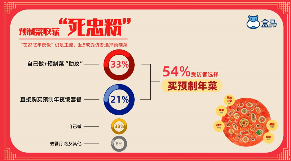 春节对预制菜的人气加成同样有目共睹。盒马方面的调查就显示,虽然自己下厨准备年夜饭仍是中国家庭的主流选择,但愿意购买预制菜的用户较过去几年有明显增长。其中,54%的受访者表示会购买预制年菜,另外还有21%的用户表示会直接购买预制年夜饭套餐。