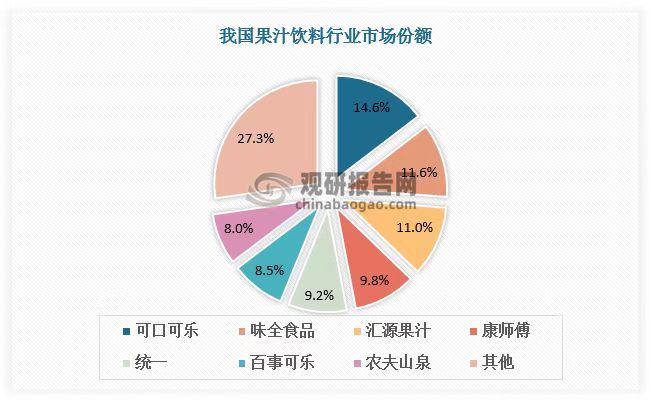 但是如今,根据观研报告网发布的《中国果汁饮料行业发展现状分析与未来前景调研报告(2022-2029年)》显示,果汁饮料市场份额前三的企业分别为可口可乐(中国)、味全食品、汇源果汁,其中,汇源已降至第三,市场份额为11.0%。
