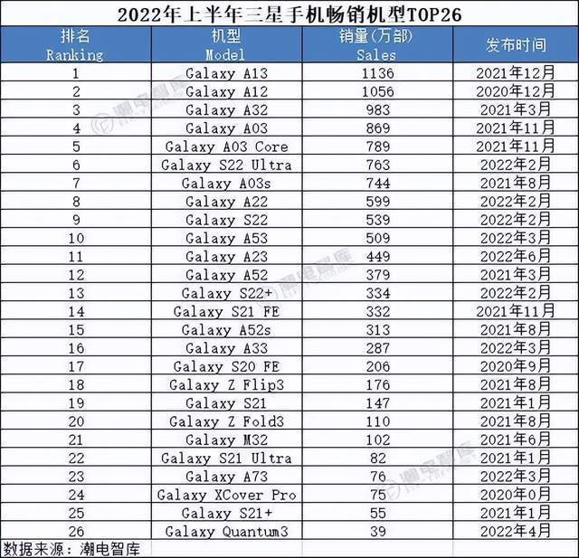 日前,潮电智库发布了一份统计数据,数据显示,三星在2022年上半年畅销手机机型中总销量为1.11亿部。其中,畅销的机型有26款,前三机型销量分别是GalaxyA13,销量1136万部;GalaxyA12,销量1056万部;GalaxyA32,销量983万部。