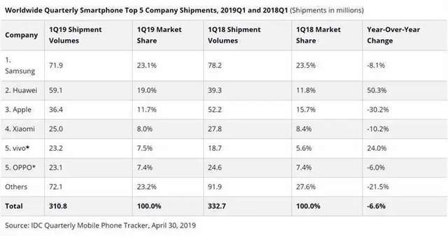 2019年Q1华为季度出货量持续攀升,出货量高达5910万台,和三星的季度出货量差缩减到1180万台。也在2019年Q1,华为手机的全球市场份额达到了19%,三星手机全球市场份额是23%,差距越来越小。