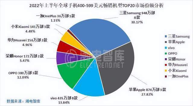 根据潮电智库统计,三星在600-799美元、800+美元的畅销机型TOP20品牌汇总中,输给了苹果,位居第二;