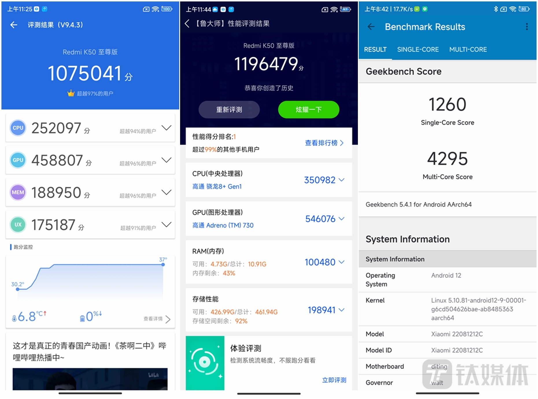 跑分方面的成绩,也印证了这一观点,安兔兔整机得分1075041鲁大师整机得分1196479GeekBench单核心1260多核心4295,这都与此前钛媒体App测试过的旗舰机型相当,同时相较于上半年的旗舰机型有所提升。
