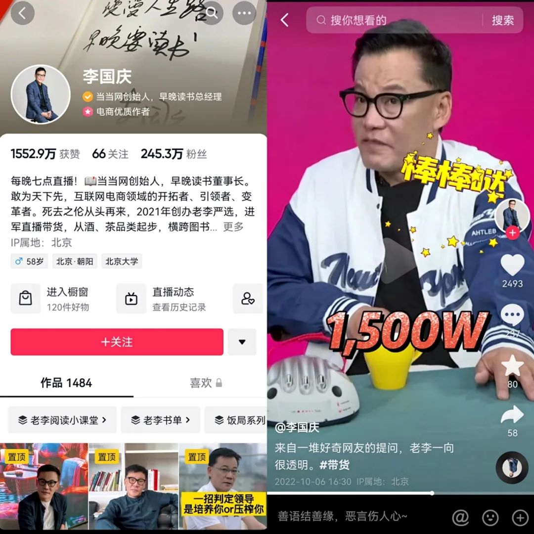 当时上架的商品还和主业有一丝相关,从早晚读书卡,到标价249元的“李国庆创业大课”,尽管销售量惨淡——直播4小时,销售额仅60万元。但李国庆依然不遗余力地巩固着自己“职场博主”的人设,给新的创业项目“早晚读书”宣传站台。如今,卖书反而像是副业,组建专业直播团队后,李国庆将带货重心转移到酒水品类,还拥有了接地气的称号“庆子”。