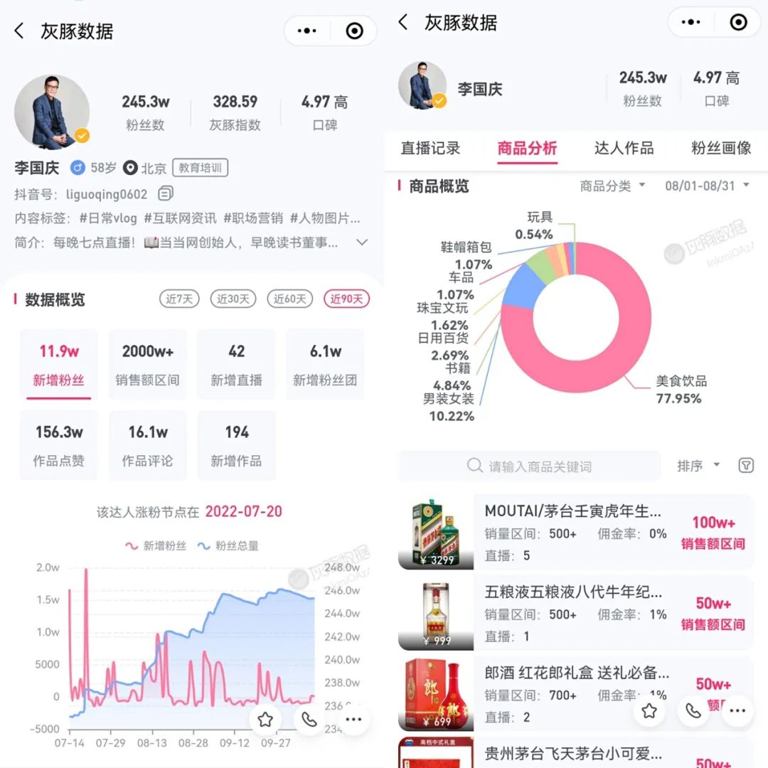 消费者不买账,这并不令人意外。酒水品类毛利高,但是价格透明,销售渠道丰富,如果不是珍稀的限量酒,主播要说服消费者在直播间购买,本就需要更高的消费粘性。从8月的数据来看,茅台壬寅虎年生肖纪念酒、五粮液八代牛年纪念版、郎酒红花郎礼盒,标价3299元、999元、699元,是当月直播销量前三的商品,分别贡献100多万、50多万、50多万销售额。但对比淘宝天猫等电商平台,李国庆在带货价格上并无优势,后者还要便宜100—200元。