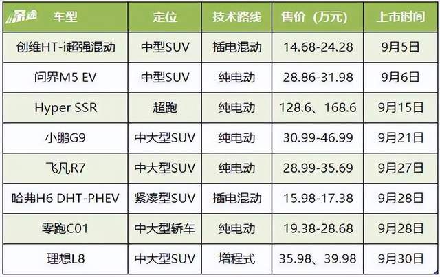 以上这些新车有轿车,有SUV,有纯电,有增程,它们唯一的共同点,是都在9月发布或上市,而且很多是在临近十一假期的前一周。