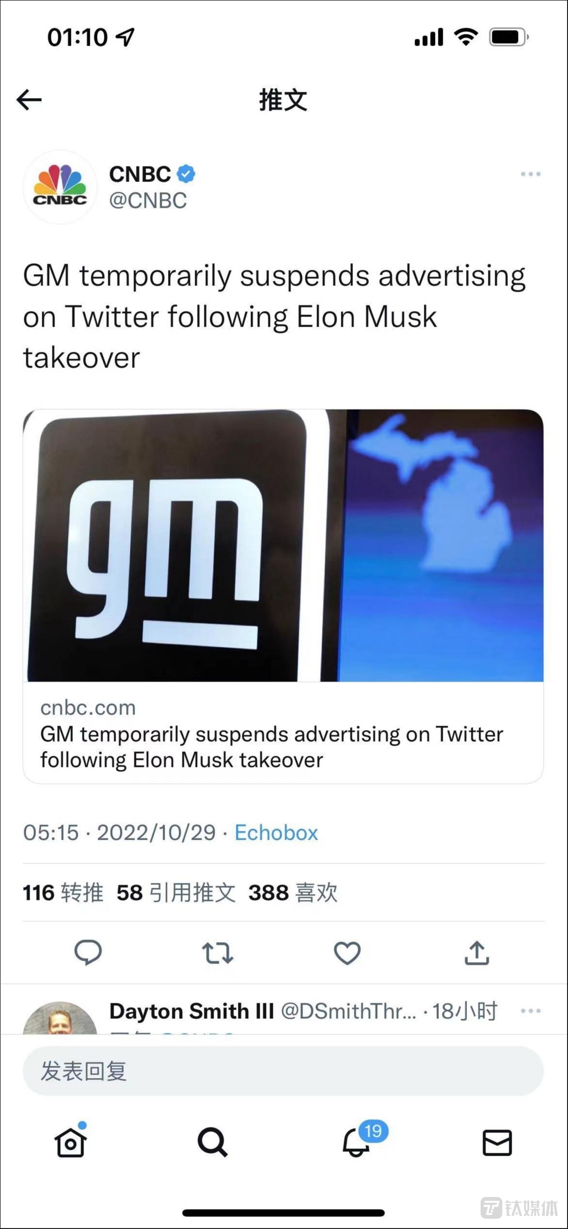 以往推特的广告投放大户通用汽车被媒体爆出暂停在这一平台上的广告投放。通用汽车对媒体表示正在与推特进行接触,以了解在其易主之后的发展方向是否会发生变化。