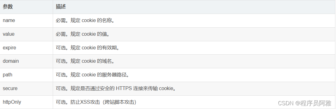 httpOnly:通过js脚本将无法读取到cookie信息,这样能有效的防止XSS攻击(跨站脚本攻击),这样就增加了cookie的安全性,即便是这样,也不要将重要信息存入cookie。