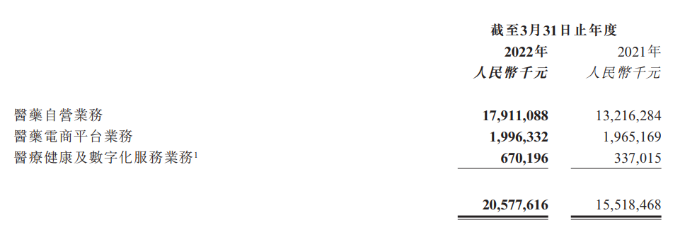 阿里健康这边,根据财报数据,上一财年来自医药自营业务的收入为179.1亿,占比高达87%,其中又有64%的营收出自以阿里健康品牌经营的自营药房药品销售。