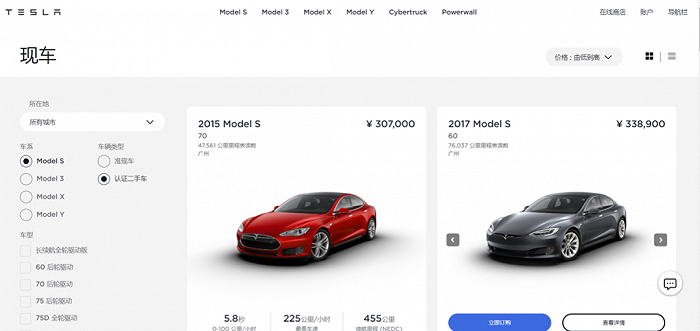 特斯拉官方认证二手车交易页面,截图自特斯拉官网