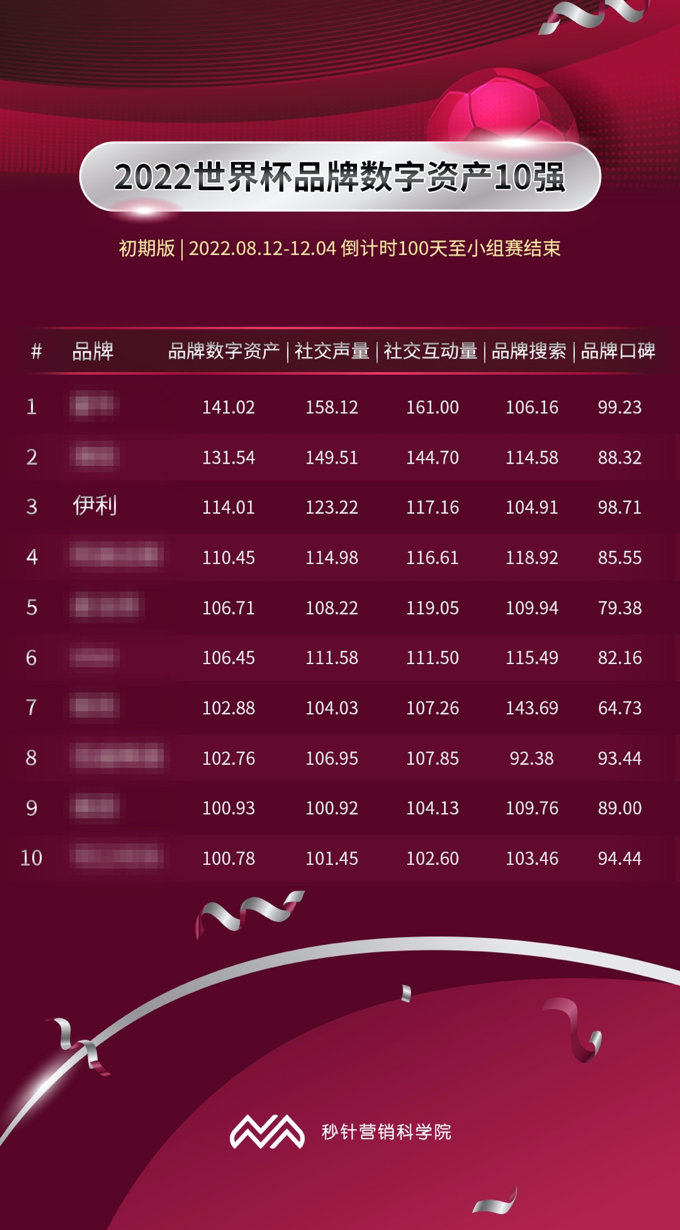 据12月4日出炉的权威机构报告指出,在整个2022世界杯数字资产10强中,第一次参与世界杯营销的伊利竟然以非官方赞助商身份挤进前三强。