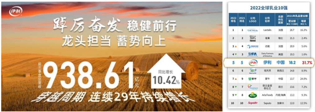 早在2005年,伊利便成为我国唯一一家符合奥运会标准的乳制品企业,2008-2022年多届奥运会、冬奥会都未缺席。17年奥运情怀,也见证了伊利从百亿到千亿的营收跨越。如今,伊利已成为全球第五家千亿级营收乳业巨头。根据公司财报显示,伊利前三季度营收938.61亿,增速10.42%,连续29年持续稳健增长。其中,液态奶规模和市场份额继续稳居行业第一;冷饮营收以绝对优势保持销量榜第一;婴幼儿配方奶粉增速位居行业第一,成人奶粉稳居细分市场第一,奶酪同比增长高达30%以上。在今年荷兰合作银行公布“2022年全球乳业20强”榜单上,伊利更以31.7%的增速位居20强首位,品牌价值稳居全球乳品品牌榜首。