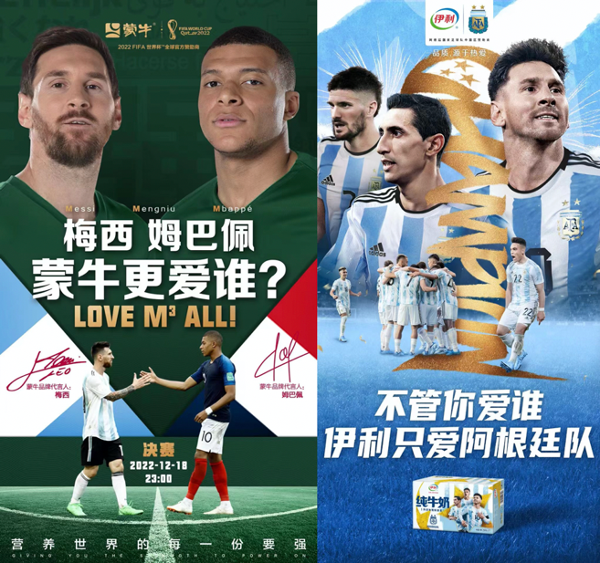两大阵营之间的暗自较劲,可不止百威与青岛这对“啤酒组”,还有蒙牛与伊利的“乳业组”。曾经看到一个说法,蒙牛重金砸下官方赞助并且手握梅西和姆巴佩两张王牌,据外媒爆料,乳企入局,在与其他企业的名额竞争中,仅赞助一项,就足以耗费企业高达7亿上下的巨额支出,且不算额外的球星代价。同样,伊利组建的以阿根廷为首的“梦之队”豪华阵容,网传价值十亿,但据多方了解实际投入还不到十分之一,从投入回报比来看,伊利显然是“使巧劲、造大势”。