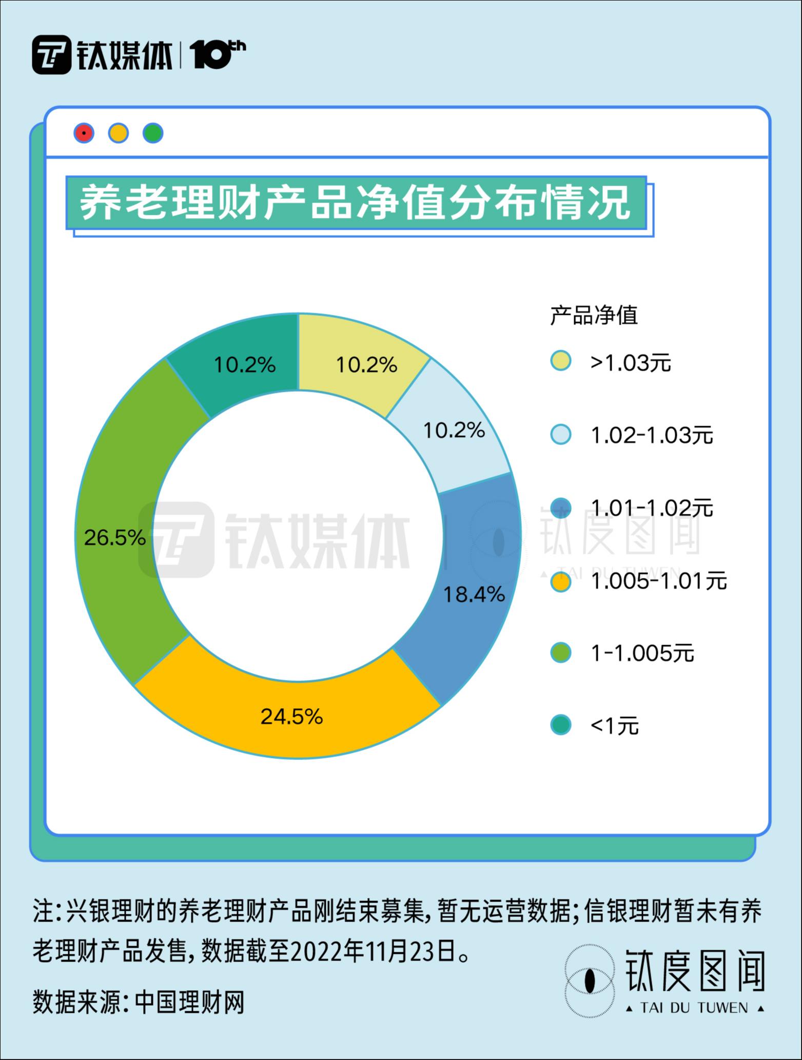 从净值表现来看,据钛媒体·钛度图闻统计,截至11月23日,49只产品的净值普遍高于1元,有所盈利。有19款产品的最新净值高于1.01元,其中,净值高于1.03元的养老理财产品有5只,4只为光大理财发行的养老理财产品,1只为建信理财的理财产品;其中5只产品出现亏损,净值低于1元。